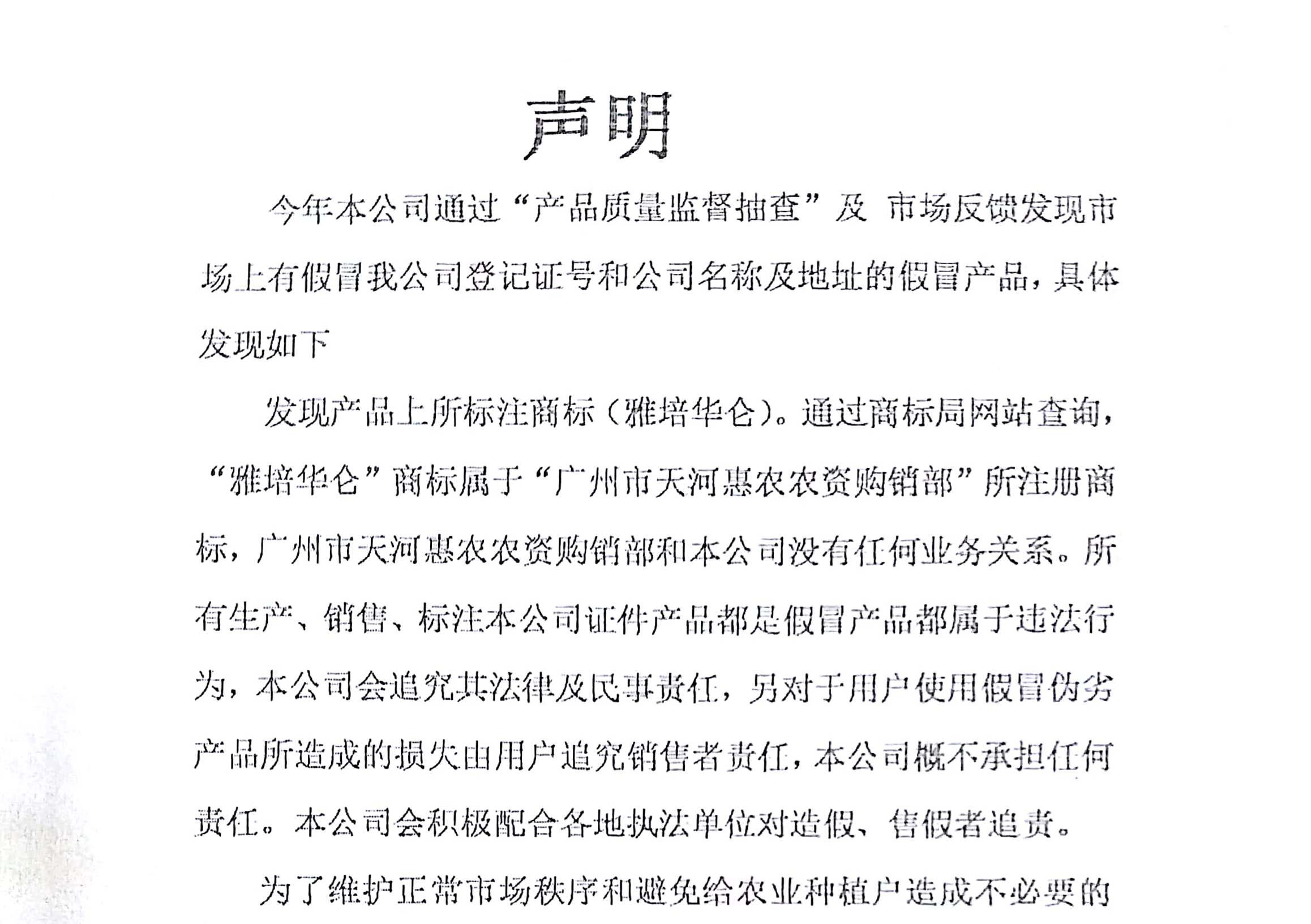 聲明 今年本公司通過”產品質量監督抽查”及市場反饋發現市場上有假冒我公司登記證號和公司名稱及地址的假冒產品,具體發現如下: 發現產品上所標注商標(雅培華…